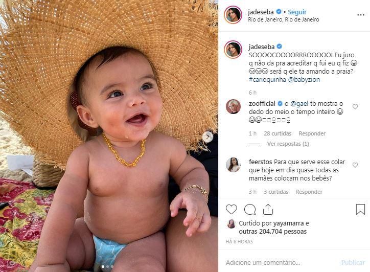 “SOOOOCOOOOORROOOOOOO! Eu juro que não dá pra acreditar que fui eu que fiz”, brincou Jade na legenda da publicação. “Será que ele tá amando a praia? #carioquinha”. Zion, de 5 meses, é fruto do relacionamento da atriz com Bruno Guedes.