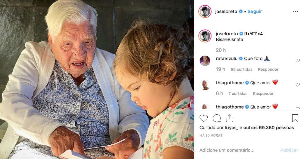 José Loreto publicou no último sábado, 17 de agosto, uma foto da filha Bella, de 1 ano, fruto do relacionamento do ator com a atriz Débora Nascimento, com a bisavó, de 95 anos.