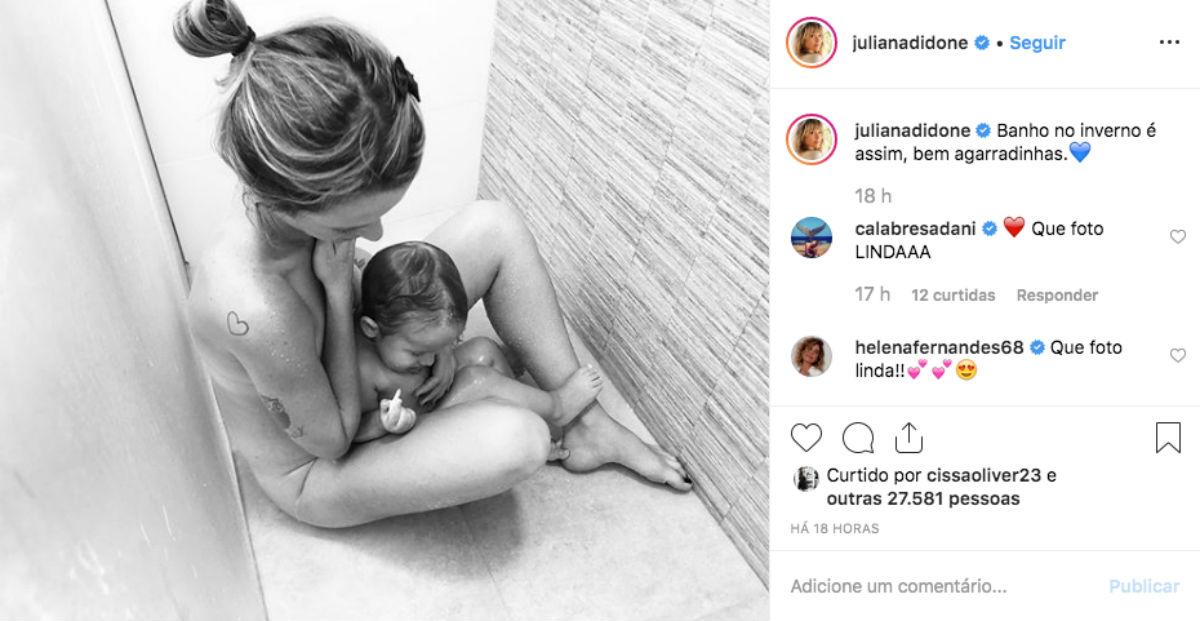 Juliana Didone publicou nas redes sociais no último sábado, 24 de agosto, uma foto com a filha Liz no colo enquanto as duas tomavam banho.