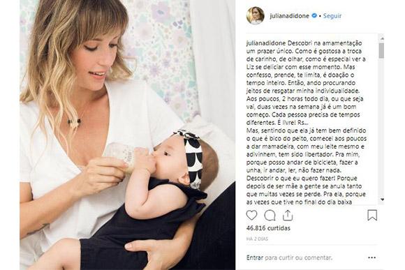 Liz nasceu no final do mês de abril e já está aprendendo a mamar na mamadeira! Segundo Juliana, por mais que a amamentação seja um ato de carinho e especial, ela também tira muito a liberdade da mãe. “Ando procurando jeitos de resgatar minha individualidade. Aos poucos, 2 horas todo dia, ou que seja vai, duas vezes na semana já é um bom começo. Cada pessoa precisa de tempos diferentes. É livre!”, contou aos fãs na rede social.