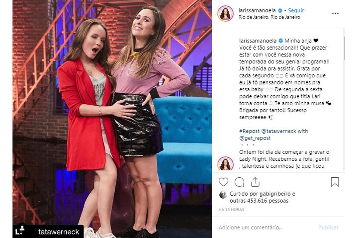 A atriz paulistana que foi ao Rio de Janeiro para a gravação do programa Lady Night repostou a foto postada por Tata e comentou: “Que prazer estar com você nessa nova temporada do seu genial programa! Já tô doida pra assistir. Grata por cada segundo! E xá comigo que eu já tô pensando em nomes pra essa baby.”