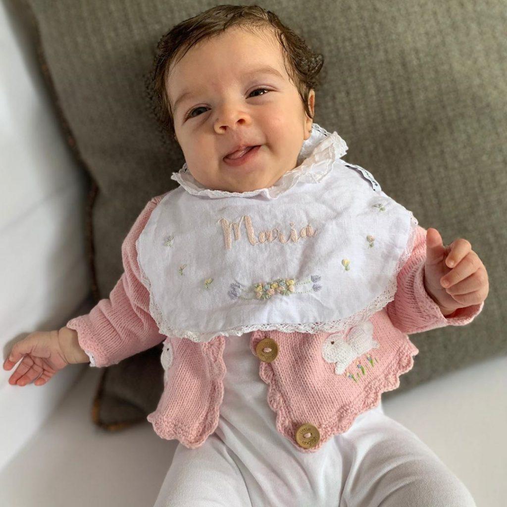 Na foto, a menina aparece com um sorriso tímido e mostra até um pouco da língua. Ela ainda usa um babador com o nome e tricô cor de rosa.