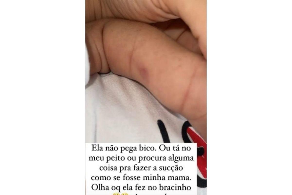 “Ela o que ela fez no próprio braço. Acabei de ver. Ela tem mania de ficar sugando, ela não pega no bico… Olha o que ela fez no bracinho dela”, mostrou nos Stories do Instagram, junto com uma foto do local.