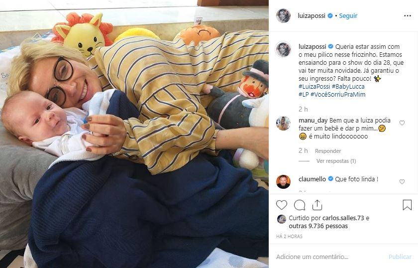 “Queria estar assim com o meu pilico nesse friozinho”, disse Luiza na legenda da publicação. Lucca é o primeiro filho de Luiza Possi com o diretor de TV Cris Gomes.