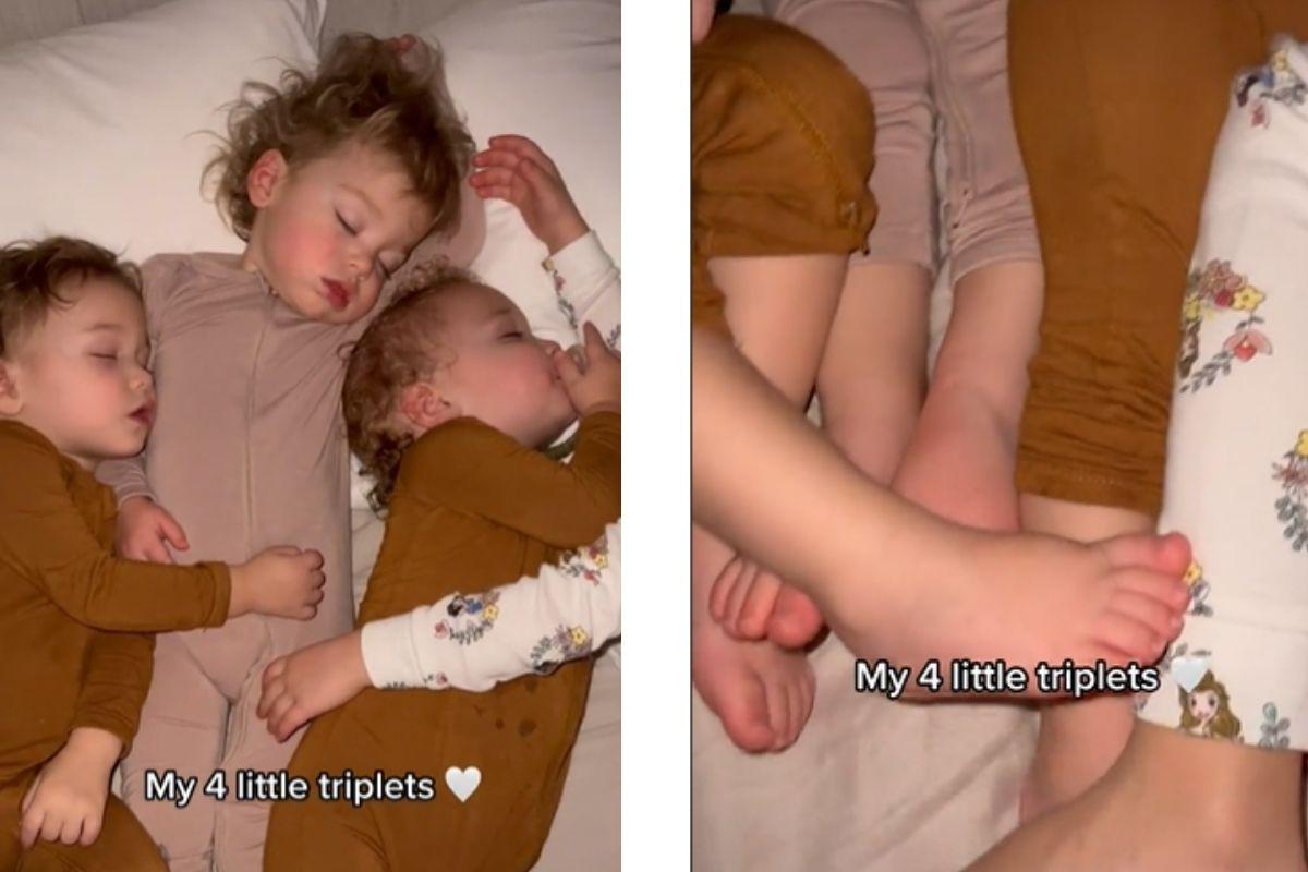 Através do TikTok, a mulher postou um vídeo adorável das quatro crianças dormindo juntas e escreveu: “Meus quatro trigêmeos”, o que deixou algumas pessoas coçando a cabeça.