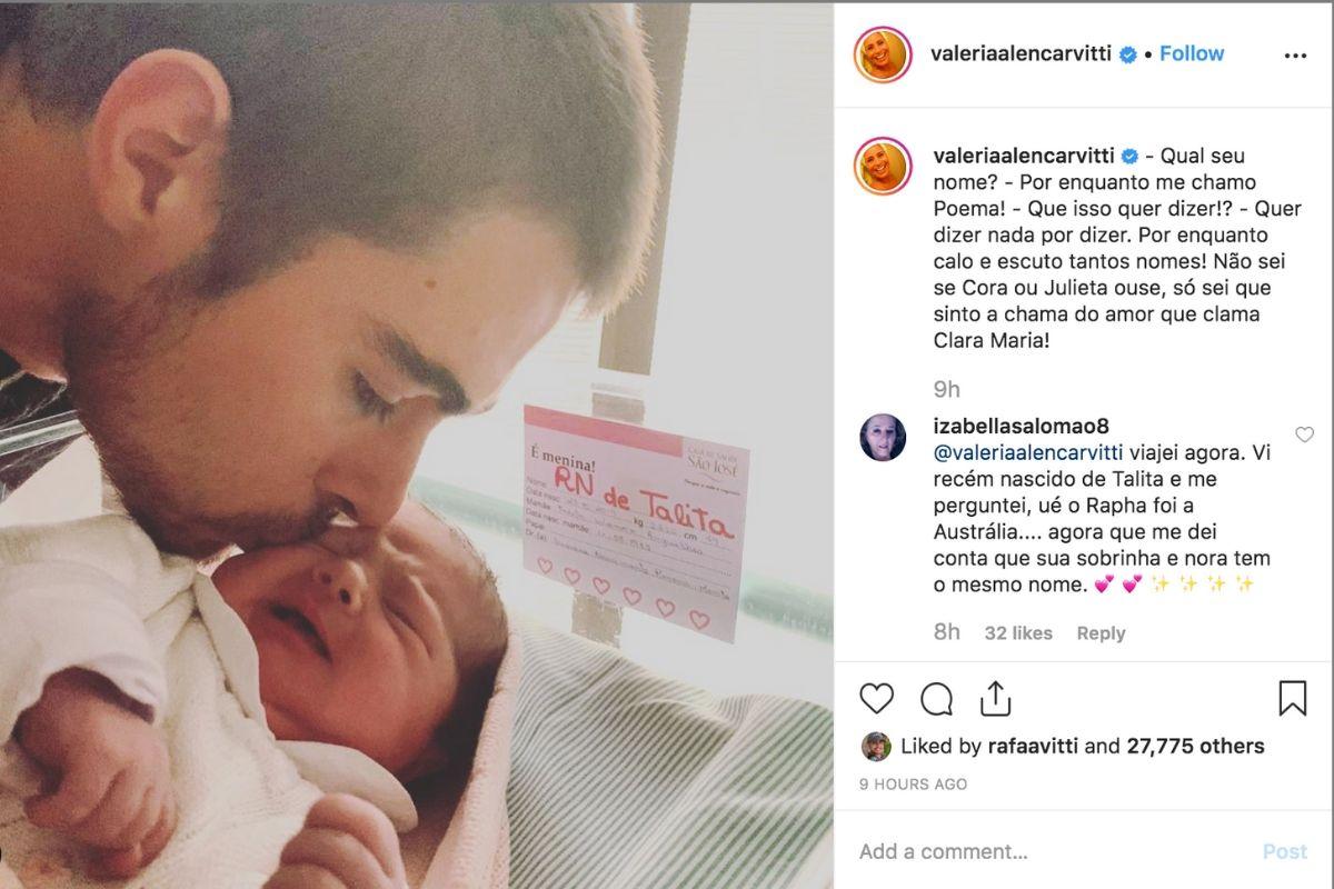 Na publicação, Rafa aparece beijando a filha, que até o momento estava sendo identificada como “Recém-nascida de Talita”. “- Qual seu nome? – Por enquanto me chamo Poema! – Que isso quer dizer!? – Quer dizer nada por dizer. Por enquanto calo e escuto tantos nomes! Não sei se Cora ou Julieta ouse, só sei que sinto a chama do amor que clama Clara Maria!”, escreveu a avó em legenda.