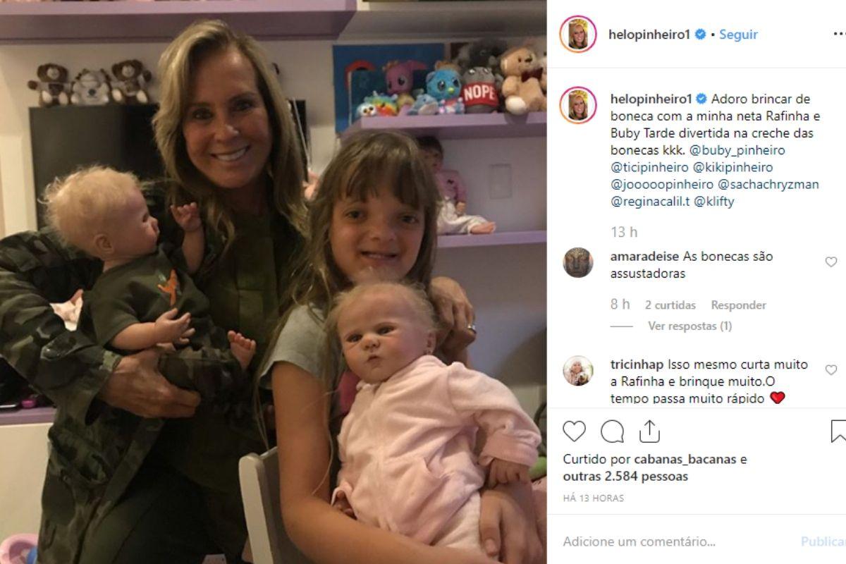 Mas não são quaisquer bonecas, são bebês reborns, aquelas que parecem crianças de verdade. Helô publicou uma foto ao lado de Rafinha e das boencas e comentou que a creche estava cheia. “Adoro brincar de boneca com a minha neta Rafinha e Buby. Tarde divertida na creche das bonecas kkk”, escreveu na legenda.