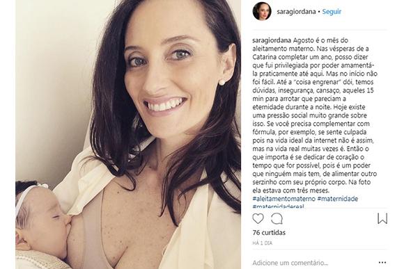Sara Giordana, mãe de Catarina, publicou um texto falando sobre o prazer de amamentar, porém também quis destacar o outro lado das mulheres que precisam utilizar a fórmula. “Hoje existe uma pressão social muito grande sobre isso. Se você precisa complementar com fórmula, por exemplo, se sente culpada pois na vida ideal da internet não é assim, mas na vida real muitas vezes é”, escreveu a designer. Leia o depoimento completo: