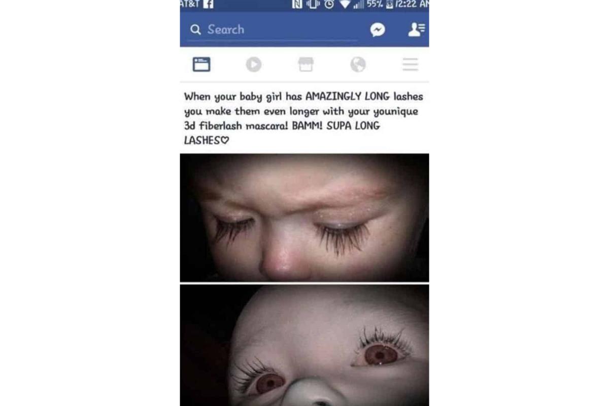 Após postar duas fotos da filha maquiada, uma mãe gerou muita indignação no Facebook. O caso aconteceu porque nas fotos, a bebê estava usando rímel e sombra. Além disso, os olhos dela estão vermelhos e lacrimejando, outras mães apontam que isso aconteceu por causa dos produtos usados de forma indevida.
