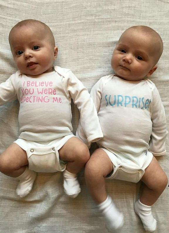 Os gêmeos Blakeley e Cade, usando roupas com frases engraçadas. “Eu acho que você estava esperando por mim”, diz a roupa de Blakeley. “Surpresa!”, responde a de Cade. (Foto: Reprodução / Nicole Ziesemer / SWNS)