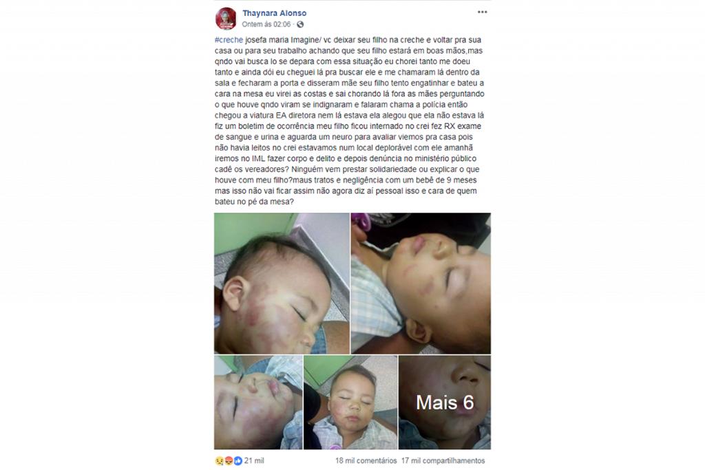 Enquanto nada se resolve, o sentimento de Thaynara é de revolta. “Você deixa seu filho na creche achando que ele estará em boas mãos, mas quando vai buscá-lo se depara com essa situação. Eu chorei tanto, me doeu muito e ainda dói. Mas isso não vai ficar assim”, ela escreveu no post que já tem mais de 20 mil curtidas.