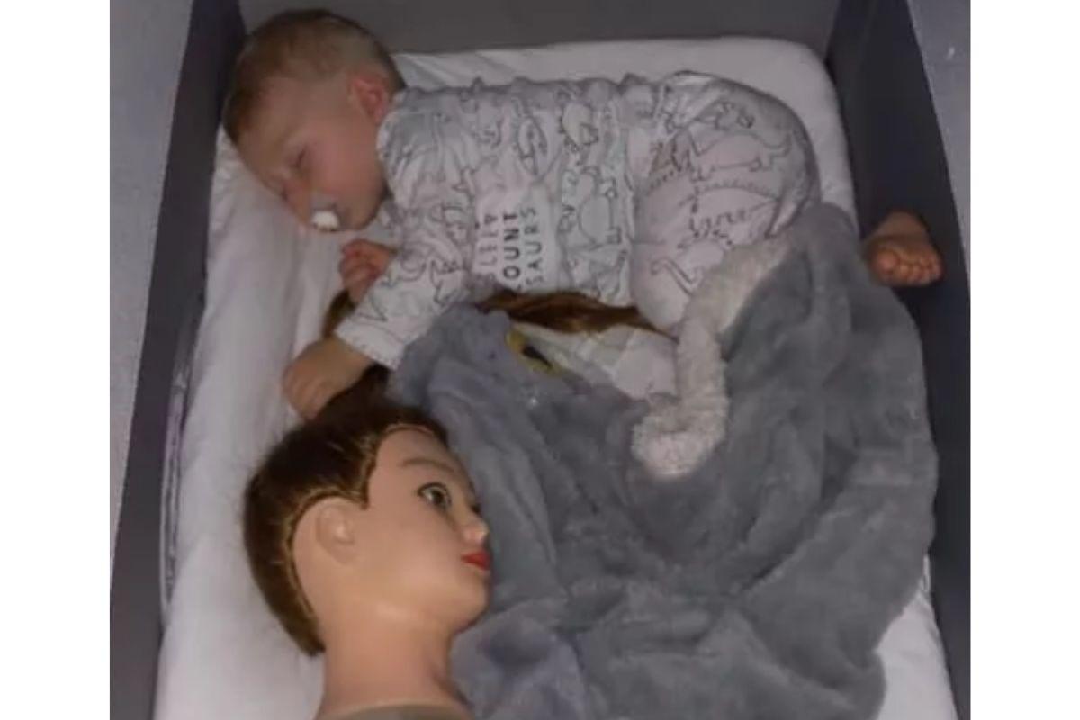 Agora Harry dorme tranquilamente com o manequim (Foto; reprodução/ Bebê Mamãe)