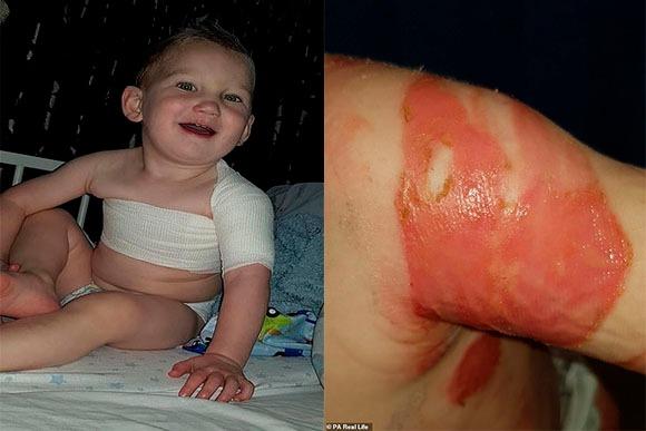Tracy Hallwood, de 24 anos, se distraiu por apenas um segundo quando seu filho Arlo, de 1 ano e 8 meses, derrubou uma xícara quente no próprio corpo, queimando parte do ombro.