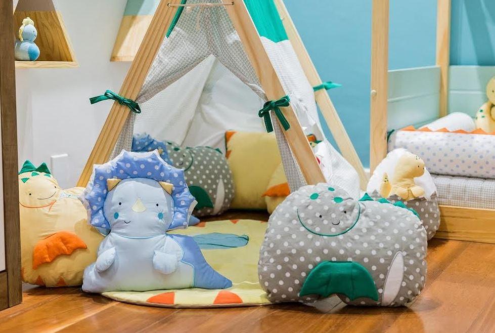 O quarto, no estilo montessoriano, ficou super colorido, com várias estampas geométricas e dinossauros de pelúcia. Tem até uma cabana e um tapete interativo para deixar ainda mais especial.