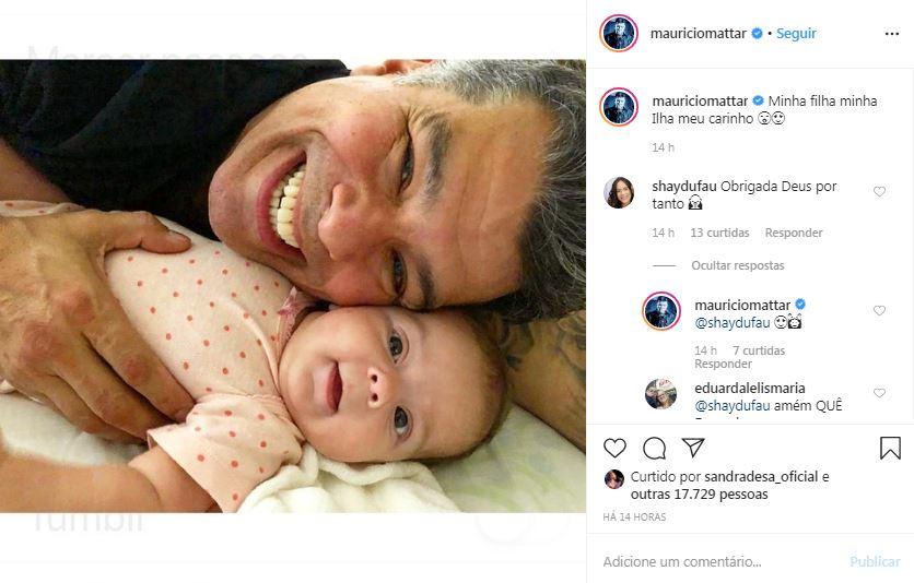 “Minha filha, minha Ilha, meu carinho”, disse Maurício na legenda da publicação. Ilha é primeira filha do ator com Shay Dufau. Maurício já é pai de Luã, de 32 anos, seu filho com Elba Ramalho; de Rayra Gracie, de 29 anos, filha do ator com Flávia Gracie, e Petra, de 25 anos, fruto de seu relacionamento com Fabiana Sá.
