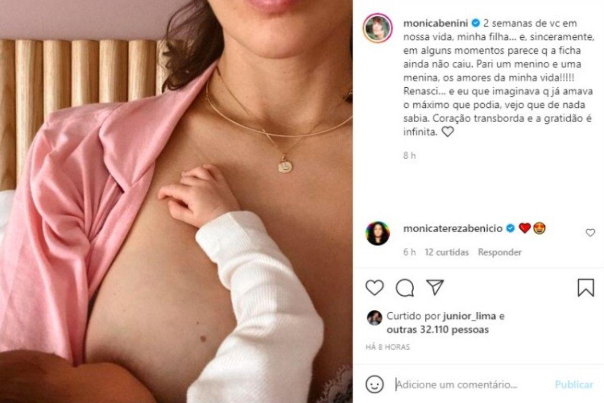 Mônica Benini compartilhou no Instagram nesta segunda-feira, 24 de outubro, uma foto amamentando a filha e aproveitou para comemorar as 2 semanas de vida da filha Lara. Ela se declarou à menina na legenda e disse que a vinda dela ao mundo mudou tudo que ela é.