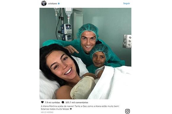 “Tanto a Geo como a Alana estão muito bem! Estamos todos muito felizes!”, escreveu o jogador do Real Madrid em sua conta no Instagram. A imagem já tem quase 8 milhões de curtidas. Com Alana Cristiano completa quatro filhos, o português é pai de Cristiano, de 7 anos e dos gêmeos Eva e Mateo, de 5 meses.