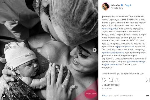 Um pouco mais tarde, a nova mãe fez uma postagem no Instagram. “Prazer eu sou o Zion. Ainda não tenho explicação. DEUS É PERFEITO e toda honra e glória é Dele! Foi tudo tão rápido que a ficha ainda não caiu, meu amor @brunoguedes mais parceiro impossível. Agora nosso pacotinho ta nos nossos braços e não largamos mais. Minha equipe é tão maravilhosa que em poucas horas fizemos um parto normal LINDO. Do jeito que eu imaginava“, escreveu e completou: ” Amanhã volto pra compartilhar mais com vocês, vamos aproveitar nossos momentos com esse gorduxo gostoso. MUITO obrigada a todas as mensagens, vocês são especiais”.