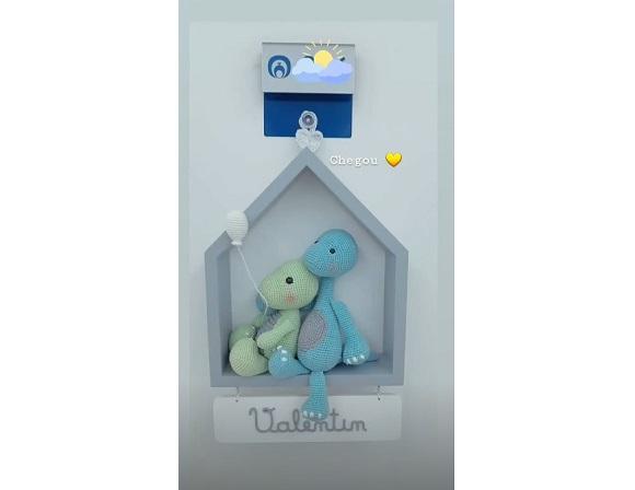 O quarto de Valentin foi feito pela Grão de Gente: a decoração escolhida foi da Coleção Tricot Luxo Branco, com alguns acessórios e almofadas da Coleção Amiguinhos Dino.