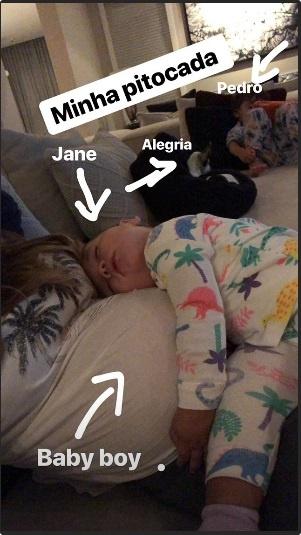 Na quinta-feira (29), Patrícia postou uma foto de Pedro deitado no sofá e Jane dormindo em cima da barriga da mãe. Na foto, também é possível ver Alegria, a mascote da casa.