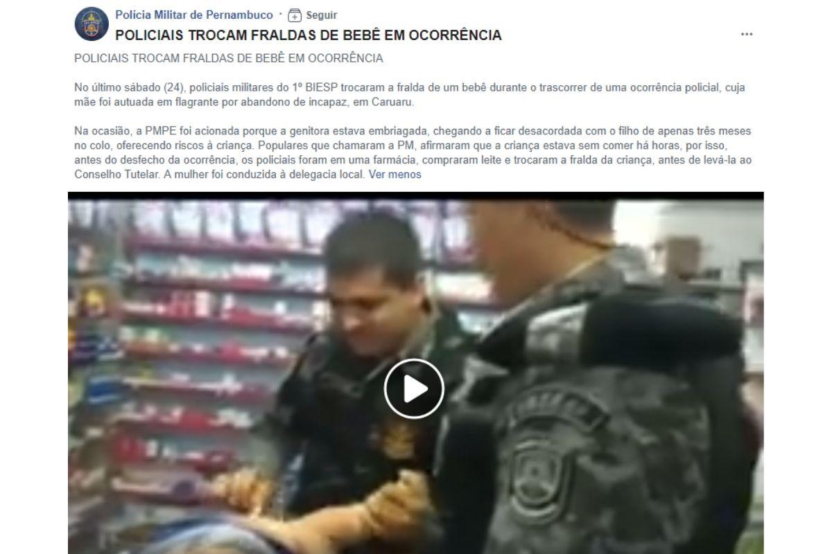 “No último sábado (24), policiais militares do 1º BIESP trocaram a fralda de um bebê durante o trascorrer de uma ocorrência policial, cuja mãe foi autuada em flagrante por abandono de incapaz, em Caruaru. Na ocasião, a PMPE foi acionada porque a genitora estava embriagada, chegando a ficar desacordada com o filho de apenas três meses no colo, oferecendo riscos à criança. Populares que chamaram a PM, afirmaram que a criança estava sem comer há horas, por isso, antes do desfecho da ocorrência, os policiais foram em uma farmácia, compraram leite e trocaram a fralda da criança, antes de levá-la ao Conselho Tutelar. A mulher foi conduzida à delegacia local”, diz a publicação.