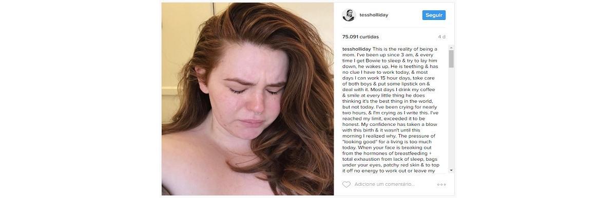 Ela é linda e tem uma carreira de sucesso. Tess Holliday é modelo plus size nos Estados Unidos. Mas Tess também é mãe de dois garotos – Rilee, 11 anos, e Bowie, 8 meses – e há algumas noites ela desabou: postou no Instagram uma foto em que aparece chorando por pura exaustão.