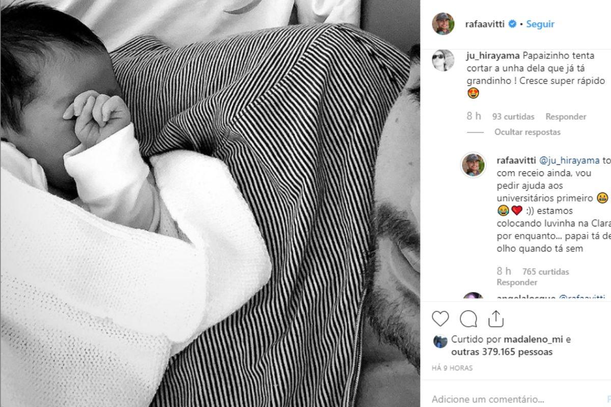 Só que teve gente que reparou na quantidade de comentários sobre a unha de Clara, que resolveu brincar com essa situação. “Sexto dia de Clarex e o povo já tá dando palpite”, comentou um fã do ator. E até o próprio Rafa respondeu: “Estou com receio ainda, vou pedir ajuda aos universitários primeiro 😬😂❤️ 🙂 estamos colocando luvinha na Clara por enquanto… papai tá de olho quando tá sem”.