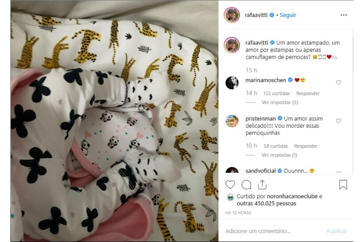 Na última quinta-feira, a publicação que o ator subiu em sua rede social não foi diferente das demais: Rafa publicou mais uma foto cheia de amor da filha. Na imagem, é possível ver Clara em um macacão estampado, deitada em um berço também cheio de estampas.