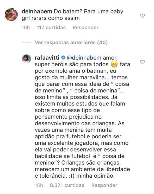 Rafa Vitti rebateu alguns comentários sobre o produto ser “coisa de menino”, complementou que esse comportamento prejudica o desenvolvimento infantil. “Crianças são crianças, merecem um ambiente de liberdade e tolerância. Minha opinião”, explicou Vitti.