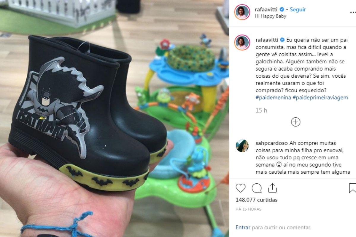 Ele aparece segurando uma galocha infantil preta com desenho do Batman na lateral. “Eu queria não ser um pai consumista, mas fica difícil quando a gente vê coisitas assim… levei a galochinha. Alguém também não se segura e acaba comprando mais coisas do que deveria? Se sim, vocês realmente usaram o que foi comprado? ficou esquecido?” escreveu, em legenda.
