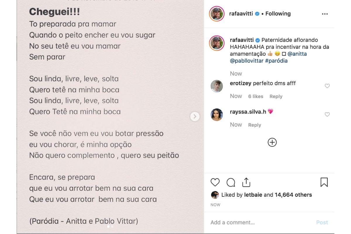 Desde que Clara Maria nasceu, Tata Werneck e Rafa Vitti não cansam de paparicar e, principalmente, brincar sobre a filha. E nesta segunda-feira, 4 de novembro, o inacreditável aconteceu: o cantor publicou uma paródia da música da Anitta com a Pablo Vittar, que fala sobre a hora de mamar da filha.