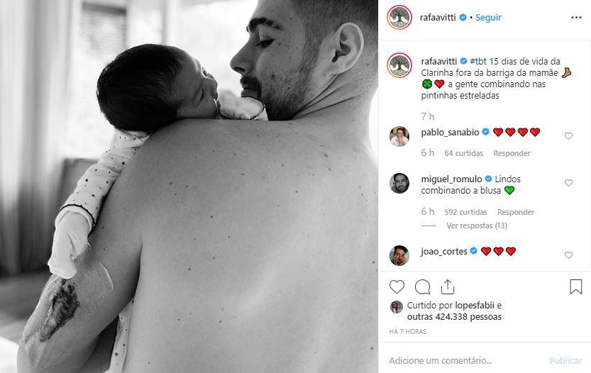 “15 dias de vida da Clarinha fora da barriga da mamãe, a gente combinando nas pintinhas estreladas”, disse o ator na legenda da publicação, isso porque Clara estava usando um macacão com pintinhas e Rafa tem algumas pintas nas costas.
