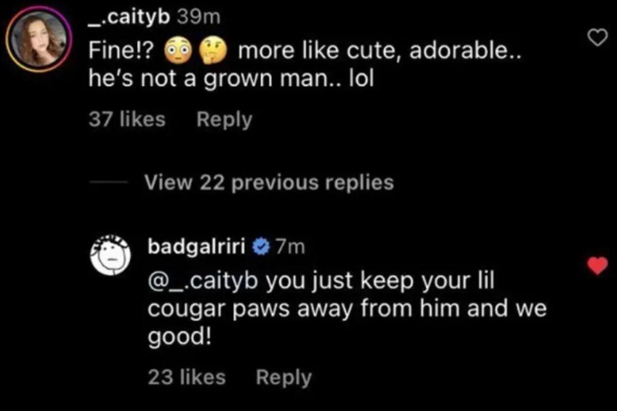 Uma das internautas chegou a dizer que o bebê não era um ‘gato’ e que o mais novo estava mais para ‘fofo’ e ‘adorável’, já que ele não é um homem adulto. Ao perceber o comentário em seu post, Rihanna fez questão de respondê-lo: “É só você manter as suas patinhas de puma longe dele e ficaremos bem!”, colocou a artista.