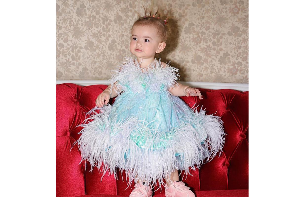 Para chegar à festa, Zoe apareceu com um look superfashion, um vestido de plumas azuis e lilás, com tênis rosa. Centenas de bexigas brancas decoram o teto do salão da festa: um arco-íris e várias nuvens espalhadas pelo local dão a impressão de que a mesa do bolo e dos docinhos estão no céu.