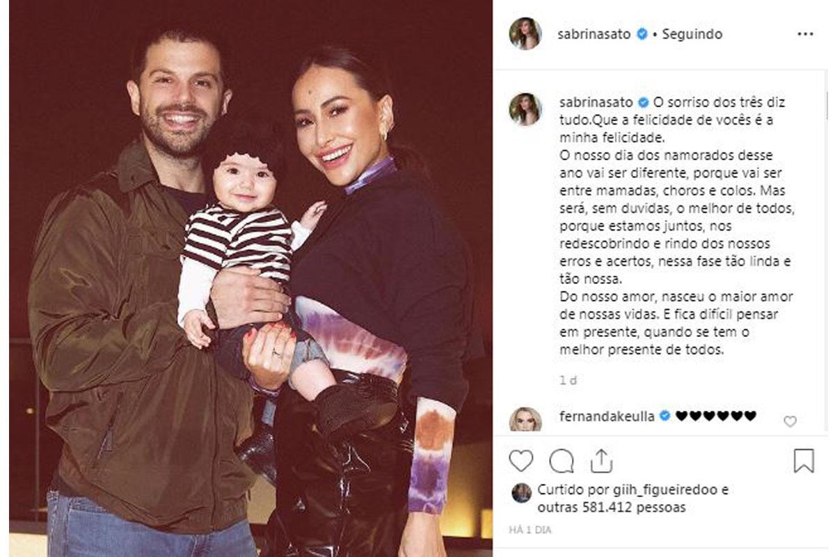 Além de compartilhar essa brincadeira com a Zoe, Sabrina também postou uma foto para falar do primeiro dia dos namorados sendo mãe e foi bem realista. “O sorriso dos três diz tudo.Que a felicidade de vocês é a minha felicidade. O nosso dia dos namorados desse ano vai ser diferente, porque vai ser entre mamadas, choros e colos”, comentou.