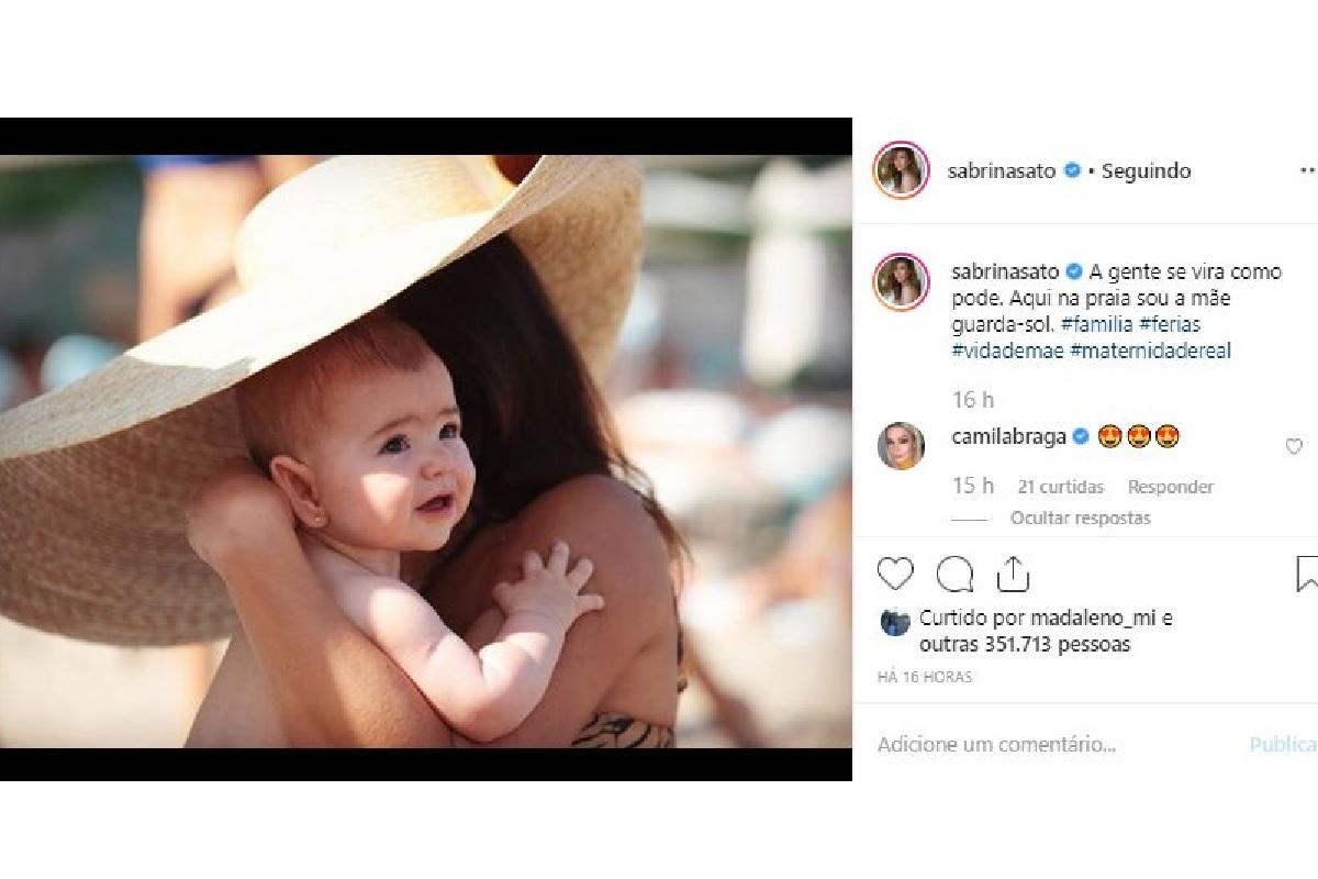 A apresentadora deu uma de gente e como a gente e se desdobrou para proteger a filha do sol. A menina de quase oito meses estava usando o chapéu da mãe como guarda sol. Na verdade, foi Sabrina quem teve essa sacada.