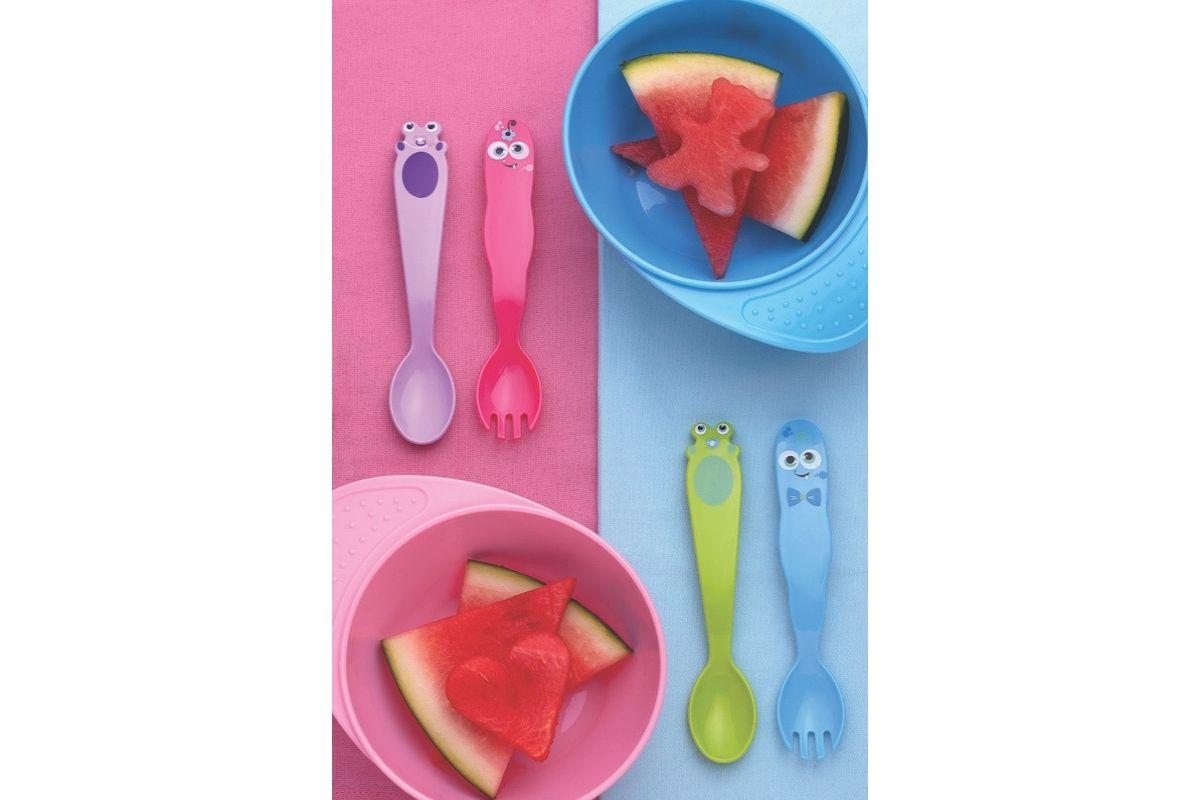 Nessa fase, é comum que a criança consiga usar tanto a colher – para alimentos como sopa e arroz – como o garfo, para pedaços de carne ou frutas picadas. Você pode tentar inserir a faca sem ponta e com serrilhado leve, para que seu filho não se machuque. A linha da Monster Kids traz desenhos e formatos de monstros coloridos, com garfo, colher e faca. A Allegria também tem um design pensado para as crianças, com desenhos coloridos.