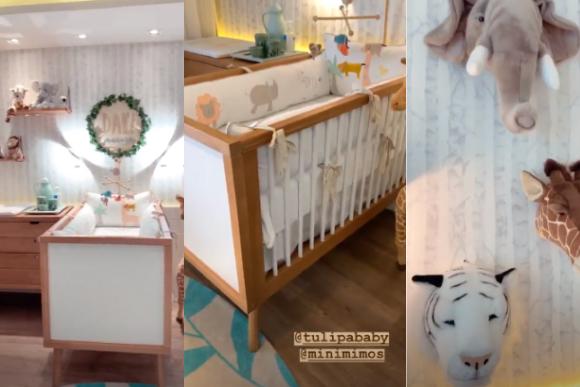 No início de julho, Gabi mostrou todos os detalhes do quarto do Davi pelos stories. O tema escolhido pela família foi uma espécie de “Safari”. São vários bichos espalhados pelo espaço, tanto de pelúcia quanto quadros. As cores são bem neutras e o papel de parede dá um charme com vários troncos desenhados. Olha só: