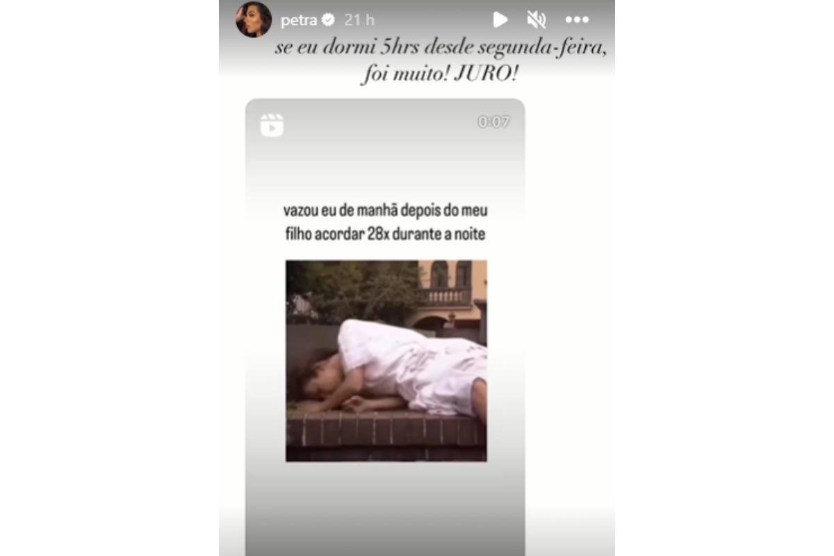 Petra compartilhou o vídeo que tinha a legenda: “Vazou eu de manhã depois do meu filho acordar 28 vezes durante a noite”. A mãe de Makai adicionou uma própria legenda para a publicação, contando que havia dormido pouquíssimo desde o dia 17 de abril: “Se eu dormi 5 horas desde segunda-feira foi muito! Juro!”.