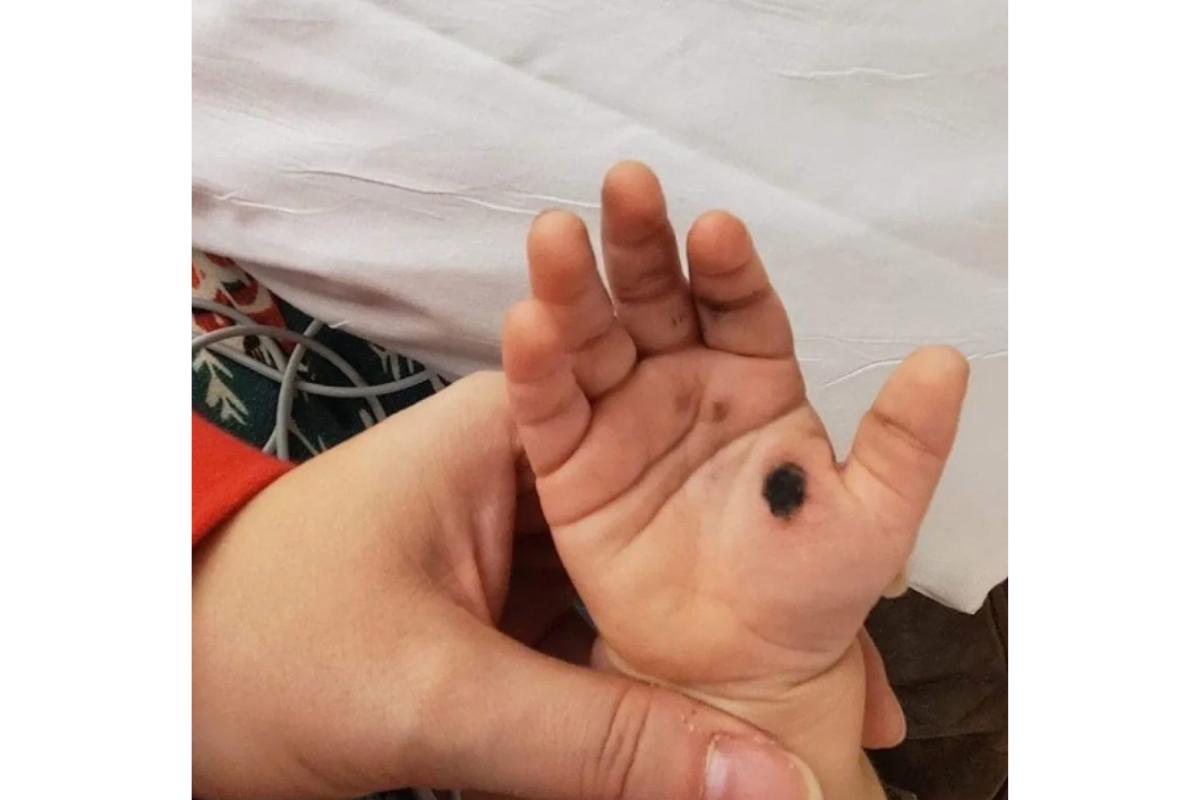 A bebê machucou a mão ao tentar colocar o carregador do celular na tomada (Foto: Reprodução / The Sun)