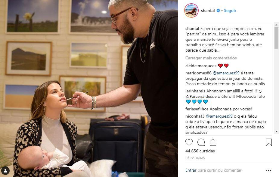 Na legenda, Shantal disse: “Isso é para você lembrar que a mamãe te levava junto para o trabalho e você ficava bem bonzinho, até parece que sabia…”, sobre o filho estar presente até quando ela se maquia para trabalhar.