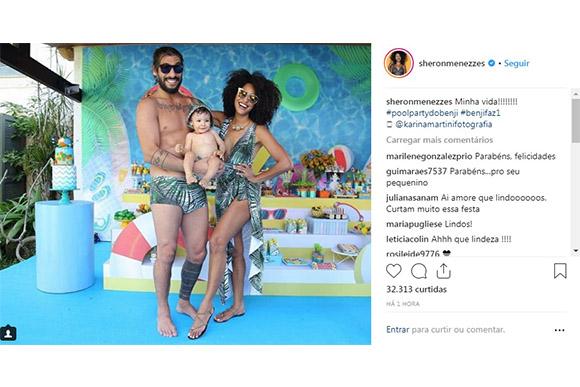 Na tarde desse sábado (13) Sheron publicou uma foto com a legenda “Minha vida” em seu Instagram junto a seu marido, o empresário Saulo Bernard, e o garoto. Na foto, todos aparecem vestidos com roupas de piscina com a mesma estampa: ela de maiô e os dois de sunga.