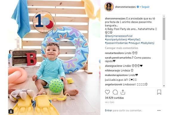 A atriz Sheron Menezes fez uma festa com o tema “Pool Party do Benji” para comemorar o primeiro ano de seu filho. A mãe demonstrou uma superpreparação para o evento em seu Instagram e postou fotos de um ensaio do Benji com o mesmo tema da festa. Segundo ela, essa seria a “Baby Pool Party do ano”.