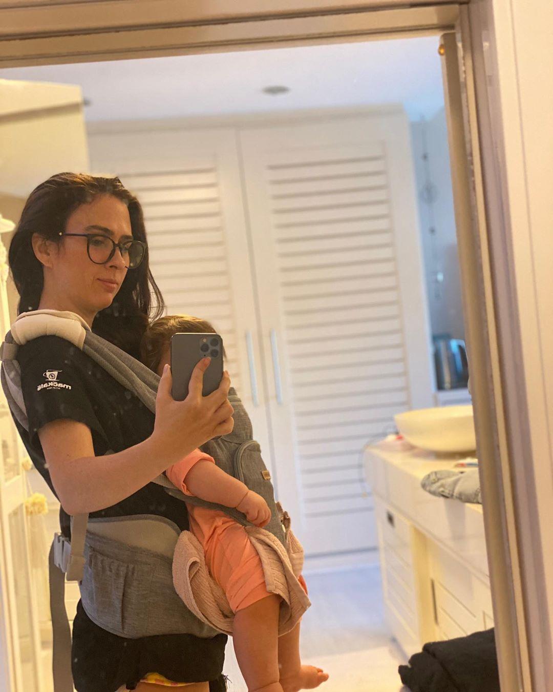 Ela tirou uma foto frente ao espelho, carregando a filha em um canguru: “Tata tem 1,53. Maria tem 80 centímetros. Daqui a quantos anos Maria terá o dobro da altura de Tata? E daqui a quanto tempo João terá o dobro da altura de seu pai porque eu tô calculando esse troço desde a quinta série e João tá sempre nessa dúvida”, brincou.