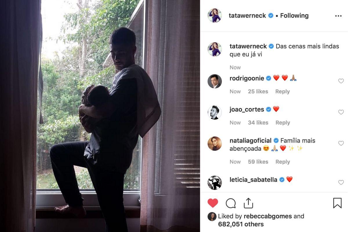 Em frente a janela do quarto, Clara Maria está no colo do ator, que provavelmente está colocando a menina para ninar. “Das cenas mais lindas que eu já vi”, escreveu Tatá em legenda.