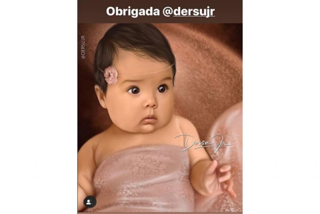 A apresentadora Tatá Werneck compartilhou o rosto da filha Clara Maria, de três meses, em uma pintura digital nas redes sociais. O desenho foi feito pelo artista Dersu Jr que a postou em suas redes sociais. “Pintura digital da Mini Deusa Clara Maria! E aí papais, gostaram?”, escreveu o artista.
