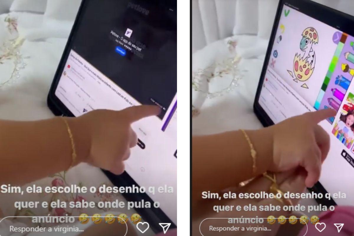Nos stories do Instagram, Virginia mostrou que a bebê já consegue escolher qual desenho ela vai conseguir assistir, além disso, Maria Alice, também já entende e sabe onde deve clicar para pular os anúncios dos vídeos.