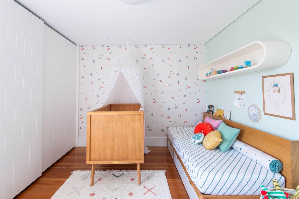 A missão da equipe da Elefante Design era aproveitar móveis antigos do quarto da filha do meio do casal, mas ainda assim trazer uma carinha de novo para o projeto da caçula. Localizado em Macaé, no Rio de Janeiro, o espaço de 12,25m² ganhou um ar de delicadeza com o combo papel de parede, paleta de cores que intercalam tons intensos e calmos e um enxoval mais discreto.