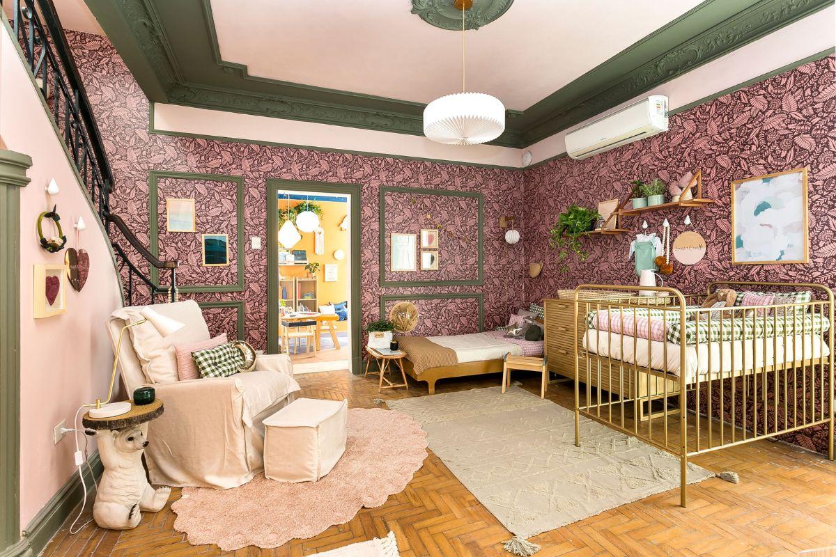 Para a decoração, o desejo da família era um quarto delicado e com elementos que trouxessem o arquétipo de feminilidade, mas sem sobrecarregar o ambiente com a cor pink. Foi utilizado, então, uma tonalidade de rosa conhecida como “milkshake” e um papel de parede floral bastante discreto. Outros itens decorativos, como pelúcias de ovelha, fecham a parte decorativa do quarto sem pesar.