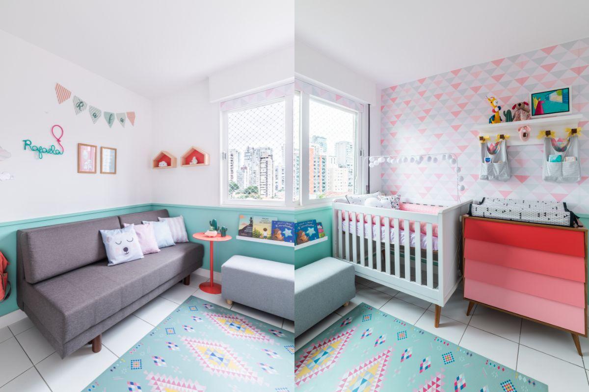 O principal desejo da família era um quarto que fosse lúdico e colorido, mas sem exagero, em toda a mobília e itens decorativos do projeto. A ideia de criar um ambiente moderno e simples ao mesmo tempo em um espaço de 9,5 m² coube ao escritório Liv’n Arquitetura, que escolheu os tons de rosa e coral para criar uma fusão entre as cores sem pesar a mão. O verde água entrou para complementar e deixar o quarto da bebê com um ar fresquinho e divertido.